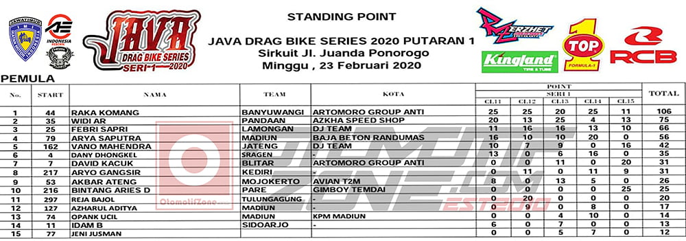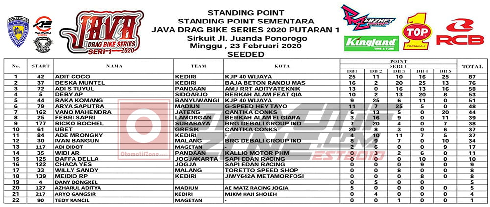Sementara hasil gelaran di awal seri ini memang masih dikuasai para pelaku lama yang juga menjadi kampiun dragbike Jatim. Sebut saja Adit Coco yangmengikuti kelas wajib yang ber Poin selalu kumpulkan pundi terbanyak, meski demikian bukan berarti rival – rivalnya bukan tak lari kencang. Karena selisih catatan waktu hitung hanya seper sekian detik dibelakang koma. Artinya Adit memang jawara meski yang lain juga kencang.