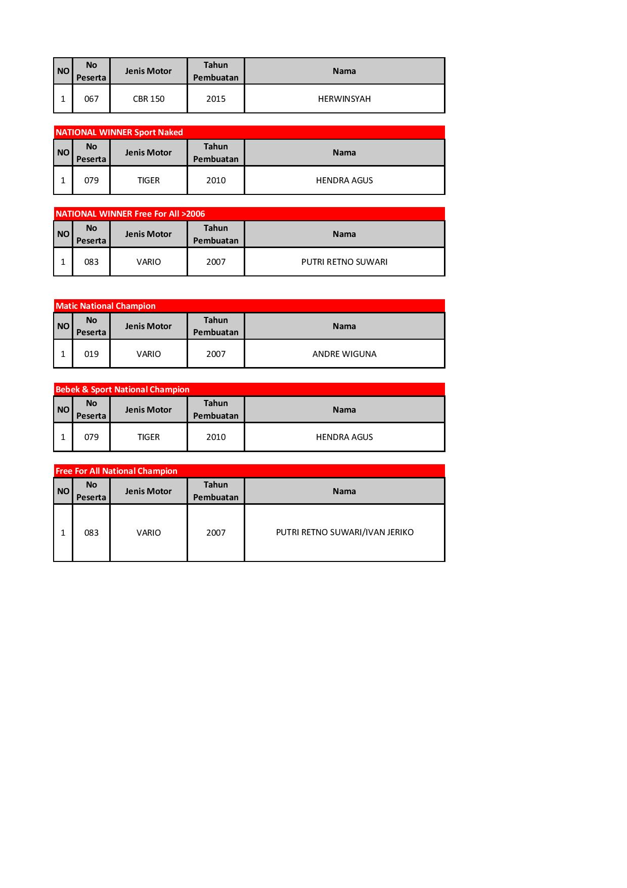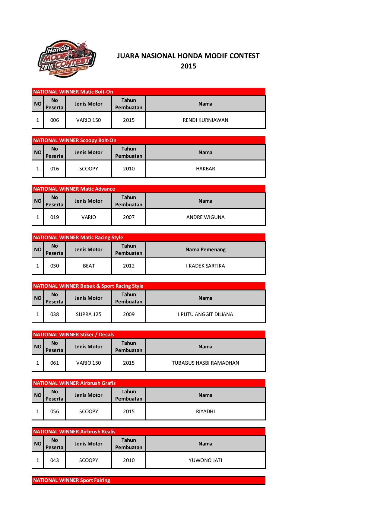 “Sejalan dengan semangat Satu Hati, kami terus berusaha mendukung anak bangsa menghadirkan karya yang terbaik dan berkualitas. Kami yakin ajang modifikasi ini mampu melahirkan keragaman gaya modifikasi sesuai karakter di daerahnya masing-masing dan menginspirasi insan modifikator Tanah Air lainnya untuk semakin berkarya melalui motor-motor Honda yang memang sudah terbukti mudah dimodifikasi.”