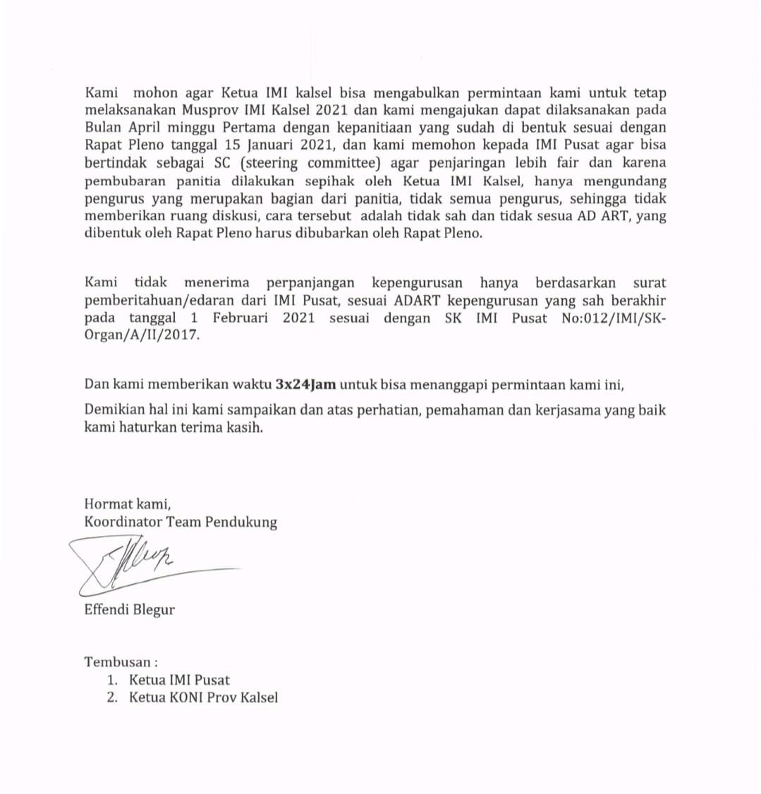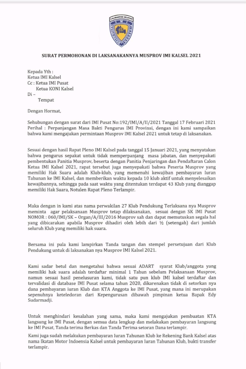 Surat permohonan Musprov yang ditandatangani 27 klub ini diserahkan ke Pengprov IMI Kalsel tanggal 8 Maret lalu.