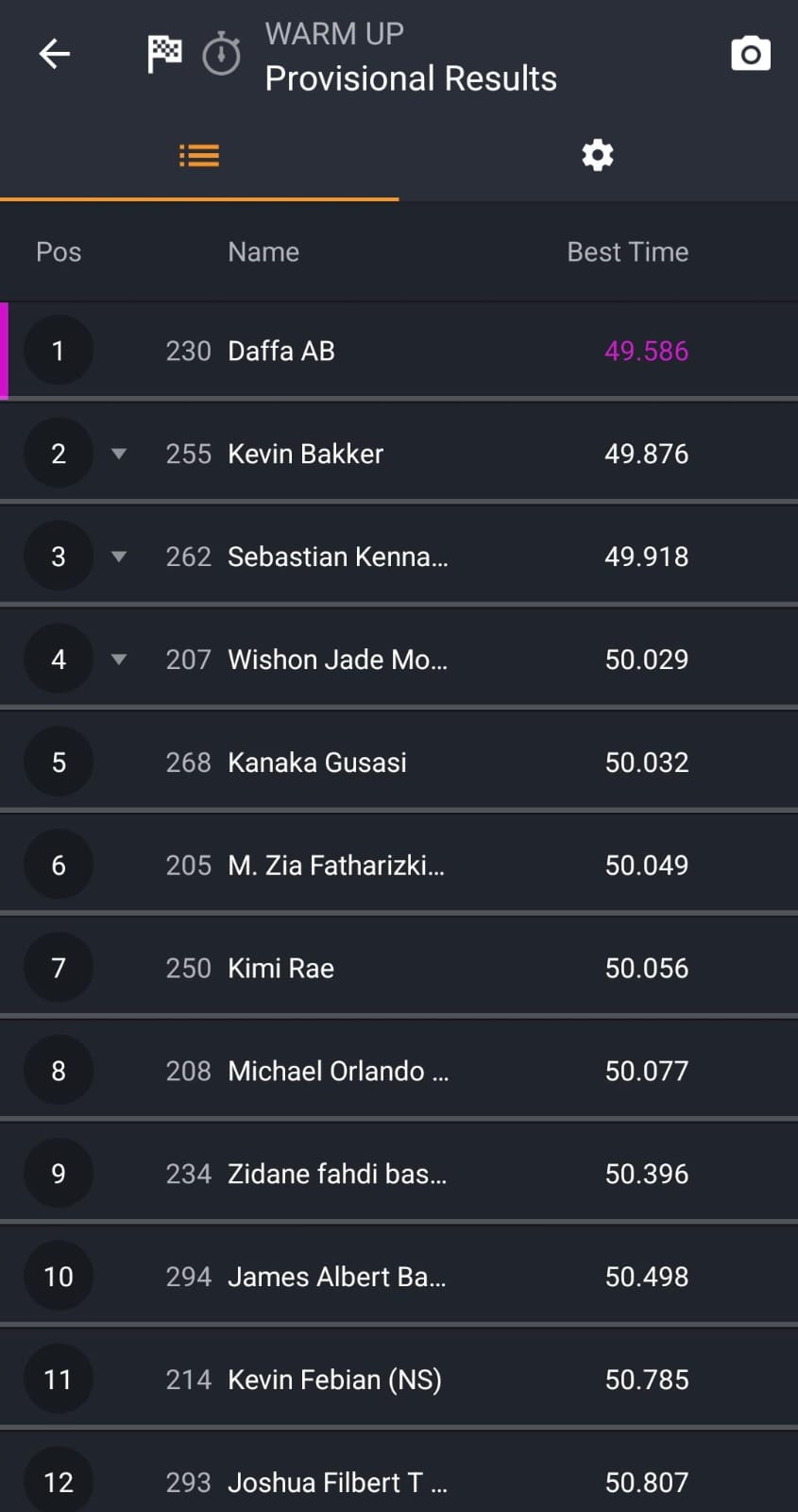 Pebalap bernomor start 230 itu mencatatkan waktu tercepat 49,586 detik, menjadi satu-satunya pebalap yang menembus di bawah 49,9 detik pada sesi pemanasan. Catatan waktunya memberi jarak cukup aman dari pesaing terdekat.