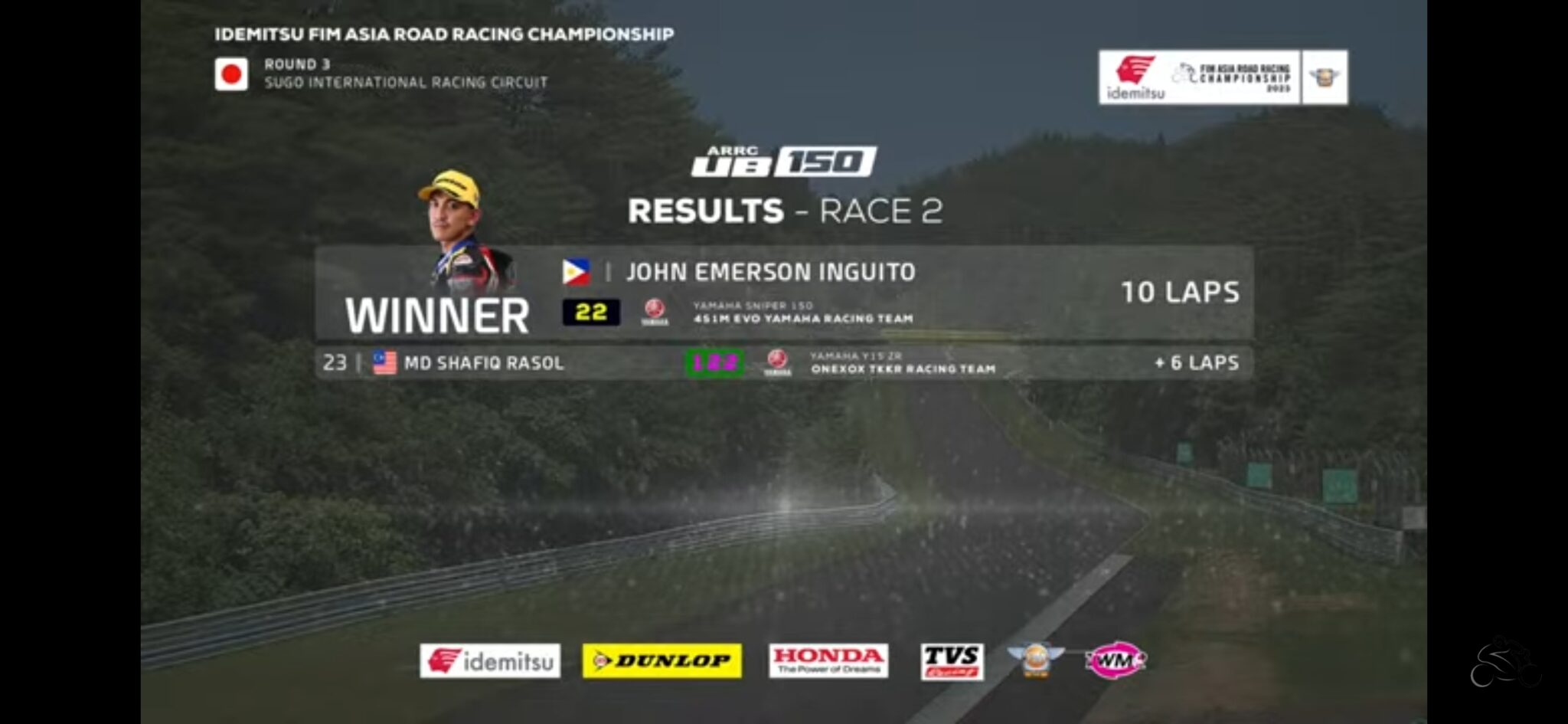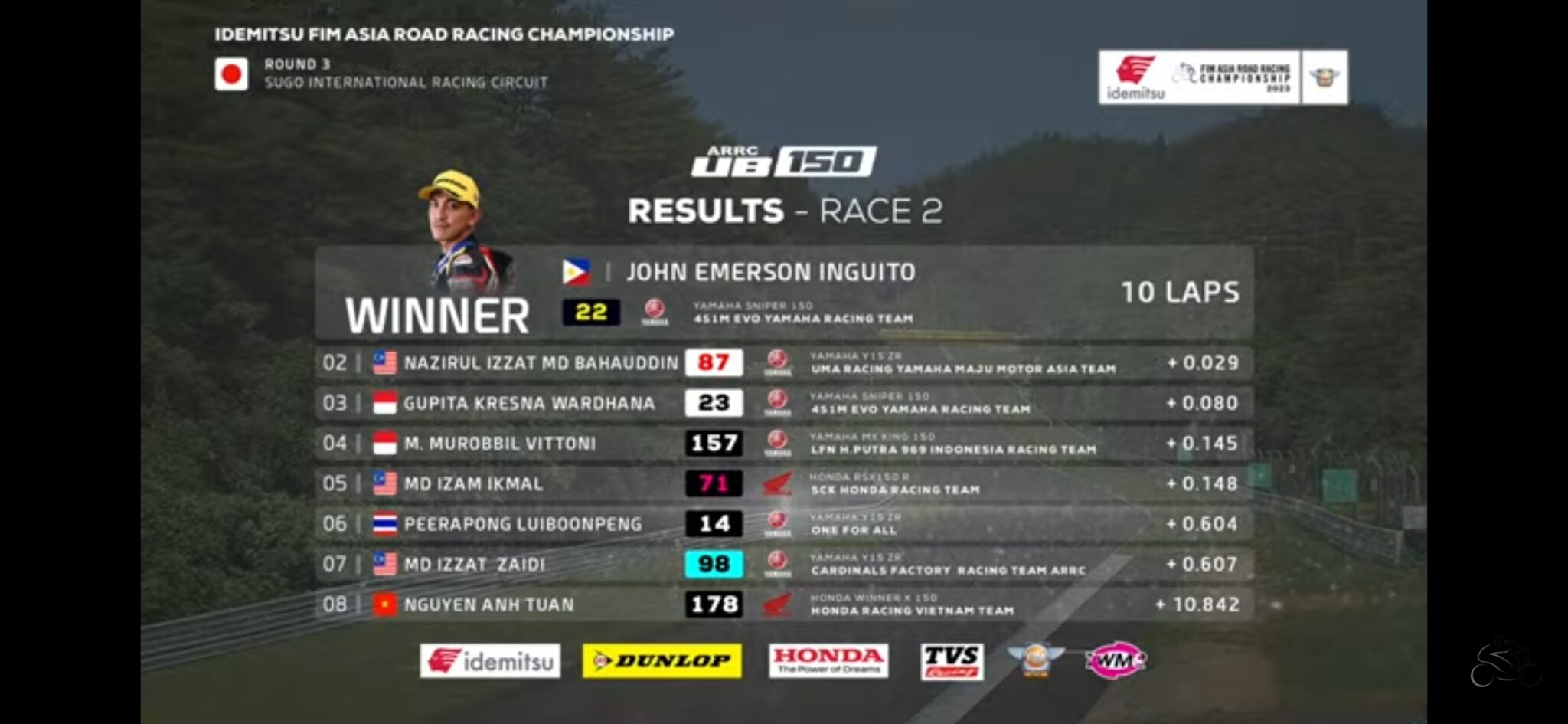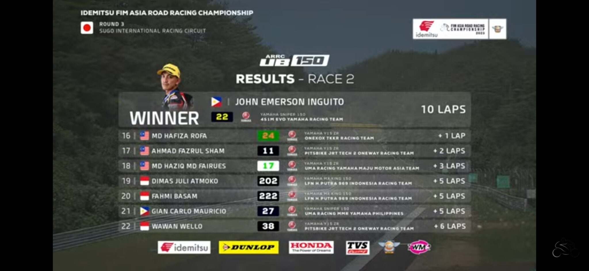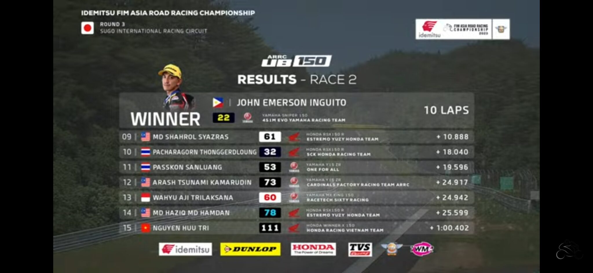 Seperti pada race 2 ini. Siapa yang mengira kalau dua pebalap 4S1M bisa kuasai Race 2. Kita tau pada beberapa sesi ini, dua pebalap ini tidak menjadi yang terbaik. Tapi pada race 2 mereka menjadi yang terbaik. Selamat untuk para juara dan tetap semangat untuk pebalap lain. Lalu posisi berapa pebalap andalan kalian? Berikut hasil lombanya:
