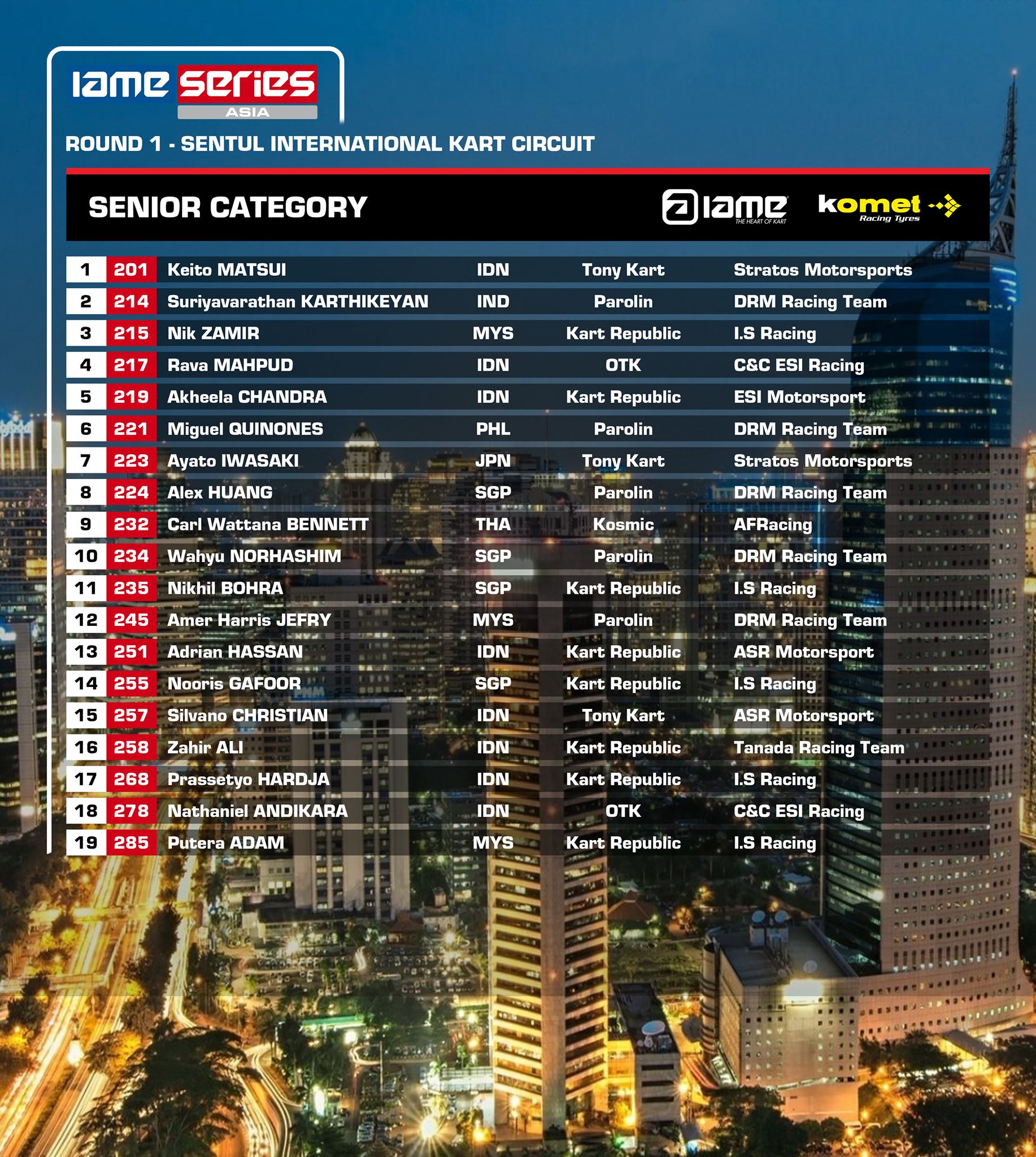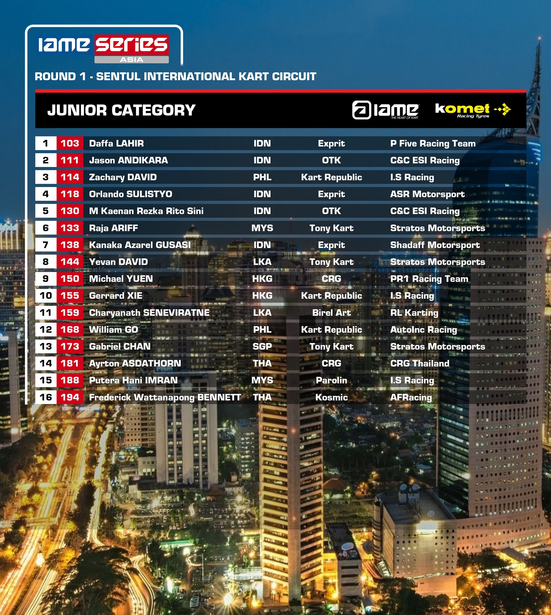 Kelas Junior diikuti 16 pegokart Asia dan 4 diantaranya dari Indonesia, sebut Kanaka Gusasi, Kaenan Reza, Orlando Sulistyo dan Jason Andikara, sementara kelas senior menjadi salah satu kelas dengan jumlah peserta terbanyak mencapai 19 pembalap, dan 8 pegokart terbaik Indonesia turun dikelas ini, juara Asia 3 kali berturut-turut, Prassestyo Hardja hadir dan turun dengan team barunya, IS racing Malaysia akan bersaing dengan para pegokart Indonesia lainnya sekelas Silvano Christian, Zahir Ali, Rava Mahpuh, Akheela Chandra, Adrian S Hassan, Nathaniel Andikara dan Keito Matsui.