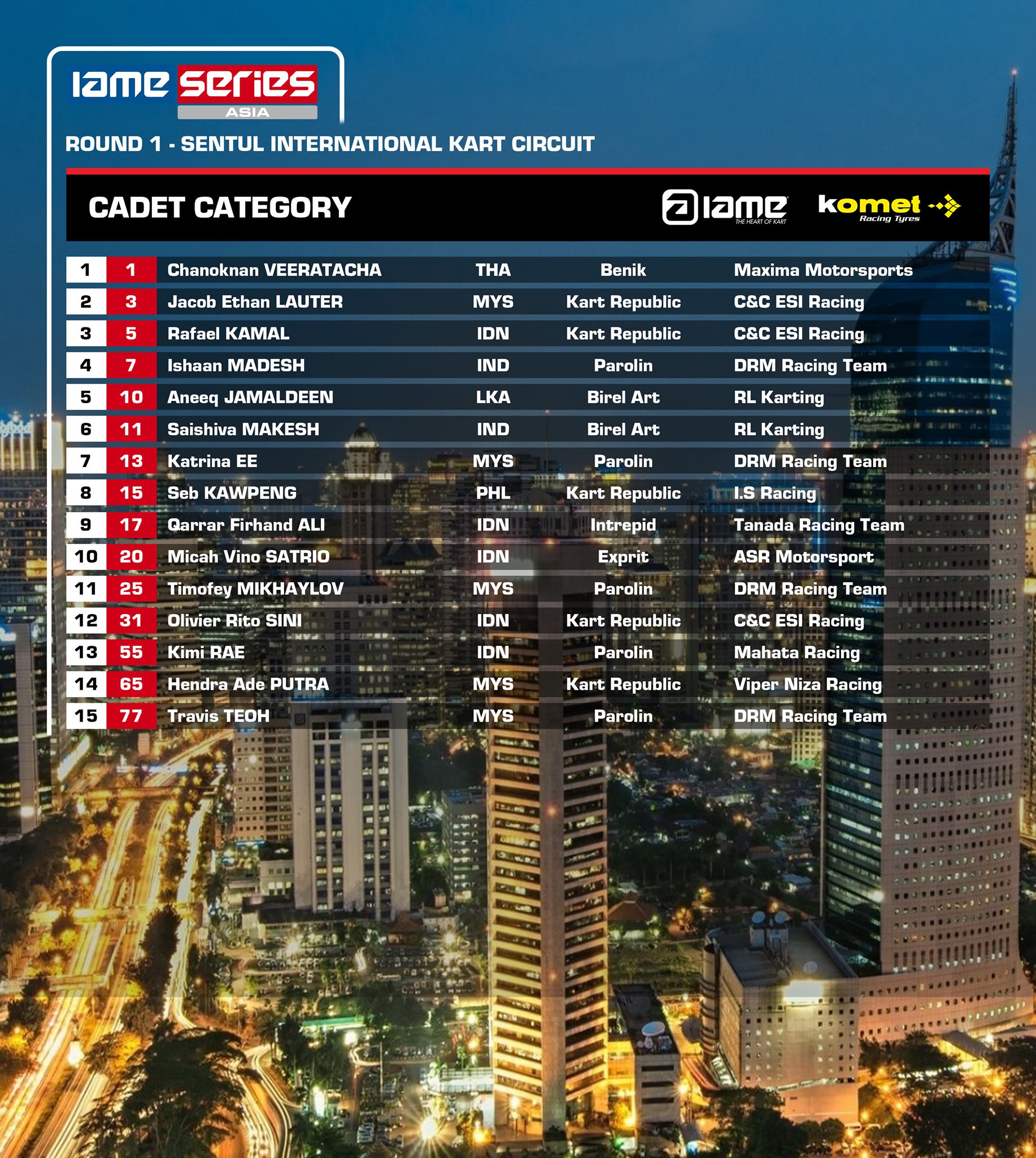 Kejuaraan internasional dengan titel IAME Asia series 2020 putaran 1 ini akan digelar Sabtu-Minggu, 22-23 Februari mendatang dengan menggelar 4 kelas, dimana 55 pegokart Asia yang turun diajang dengan X30 titel perdana event ini muncul di Asia, 20 diantaranya adalah para pegokart-pegokart Indonesia yang terbagi dalam 4 kelas. Dari 20 pegokart Indonesia yang berjuang keras Minggu ini, 5 diantaranya turun dikelas Cadet, dimana ada Rafael Kamal, Qarrar Firhand, Kimi Rae, Olivier Rito Sini dan Vino Satrio bersama 10 pegokart belia lainnya dikelas ini.