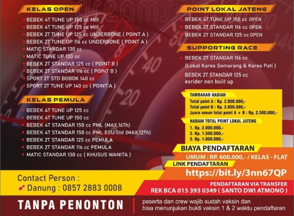 Tujuh kelas tersebut adalah Vespa, Supermoto, dua kelas cornering dan tiga kelas MiniGP. Kelas dibawah 12tahun tidak boleh karena syarat wajib vaksin. Makanya minigp ilang semua,” lanjutnya.