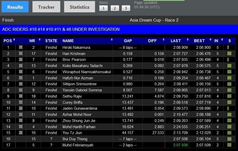 Sementara pembalap Indonesia, M Febriansyah gagal meraih kembali kemenangannya seperti di Race 1 ADC Thailand, Sabtu (7/5) kemarin yang telah mengibarkan bendera merah putih di podium ADC.