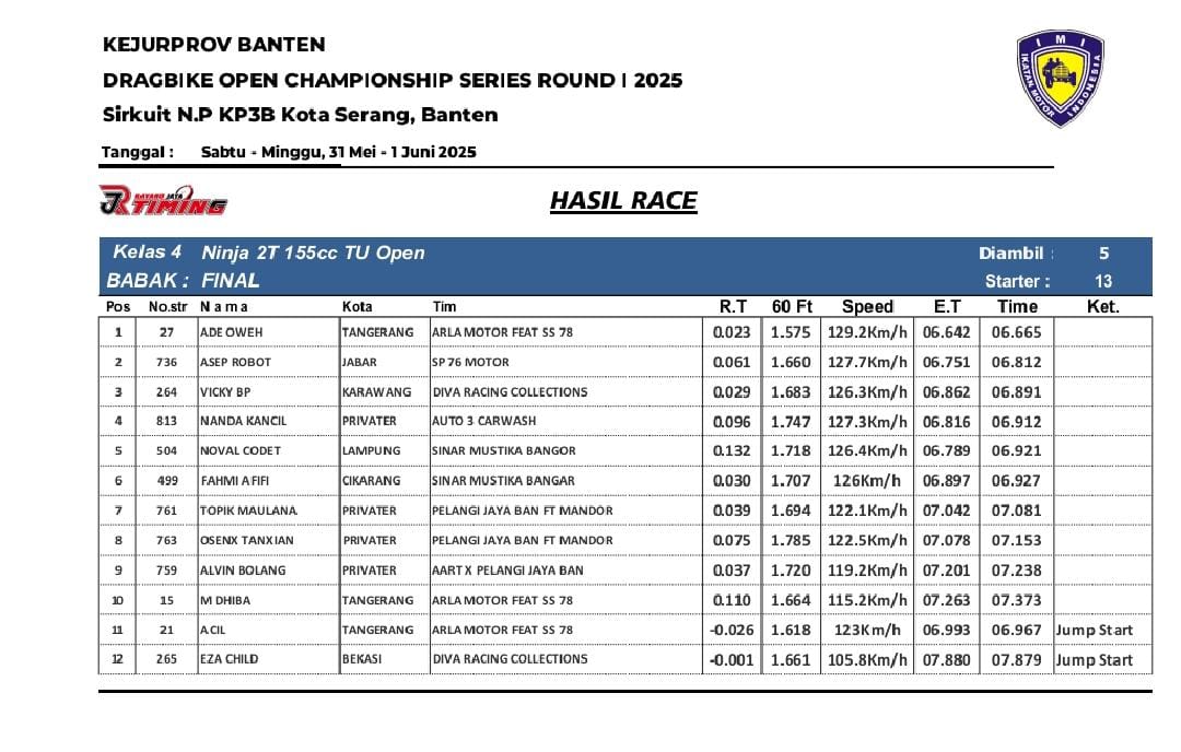 OtomotifZone.com – Banten. Kejuaraan Provinsi (Kejurprov) Banten Drag Bike Open Championship Series 1 2025 yang digelar di Sirkuit NP KP3B, Banten, mendadak heboh usai aksi gemilang dari tim Arla Motor FT SS78. Tim ini sukses mencuri perhatian lewat performa luar biasa di sejumlah kelas, termasuk kelas bergengsi Ninja 2T 155 TU Open, di mana mereka mencatatkan waktu fantastis: 6,665 detik.