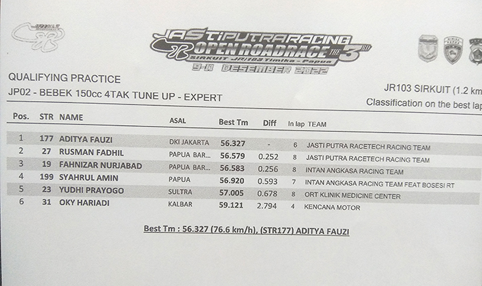 OtomotifZone.Com -Timika. Akhirnya Aditya Fauzi tuntaskan sesi qualifying practice dengan waktu tercepatnya 56.327 sekaligus mengusai Superpole. Dengan menyelesaikan waktunya 57.866 pada gelaran Jastiputra Racing  Open Roadrace Seri 3 Timika, Jumat ( 9/12).
