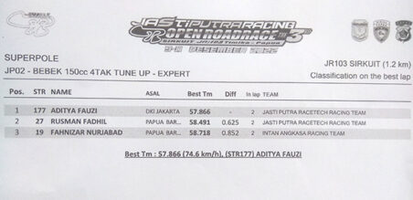 Ketiga pembalap papan atas tersebut yang mendapatkan waktu terbaiknya pada sesi cetak waktu. Melanjutkan pembuktian waktu tercepat mereka selanjutnya di Sirkuit JR 103 Timika guna memperebutkan pemenang Superpole. Meskipun waktu yang terpecahkan pada sesi tersebut tidak sebaik waktu QTT namun Aditya berkartu ijin start asal DKI Jakarta berhak dapatkan 1 juta rupiah dari sponsor persembahan Bosesi pada sesi tersebut.
