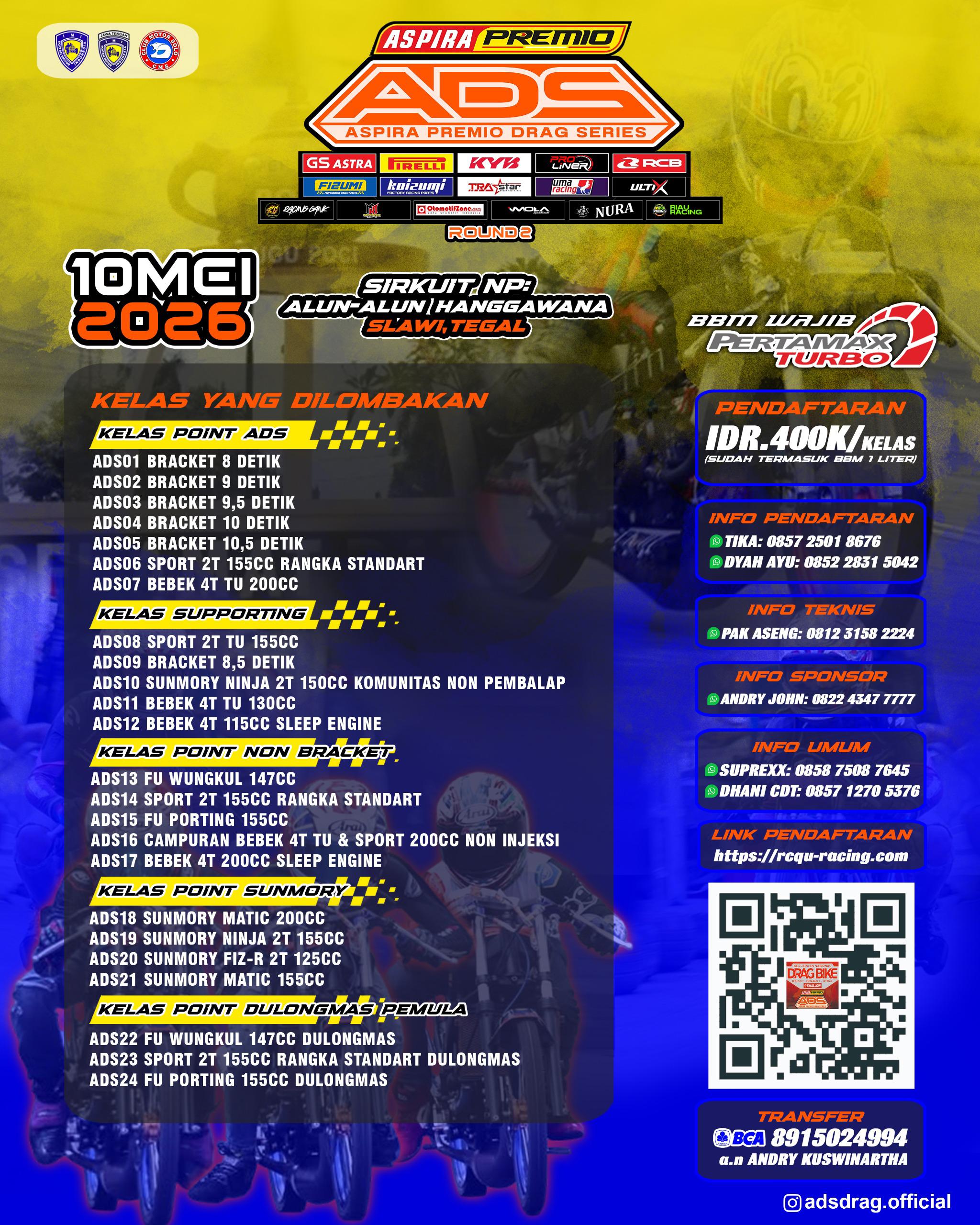 OtomotifZone.com – Slawi, Ajang balap lurus bergengsi Aspira Premio Drag Series (ADS) 2026 kembali berlanjut ke putaran kedua yang akan digelar pada 10 Mei 2026 di Sirkuit NP Alun-Alun Hanggawana, Slawi, Tegal. Event ini dipastikan bakal semakin panas dengan persaingan antar pebalap dari berbagai daerah yang siap tampil maksimal.