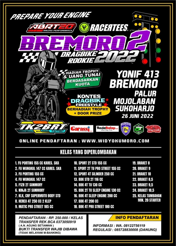 OtomotifZone.com-Sukoharjo. Sukses dengan gelaran perdana pada bulan April lalu, Bremoro Rookie Drag Bike 2022 kembali akan melanjutkan pertunjukannya pada bulan ini. Tepatnya 26 Juni 2022 bertempat yang sama dengan balapan sebelumnya yaitu di komplek Yonif 413 Bremoro, Mojolaban, Sukoharjo, Jawa Tengah.