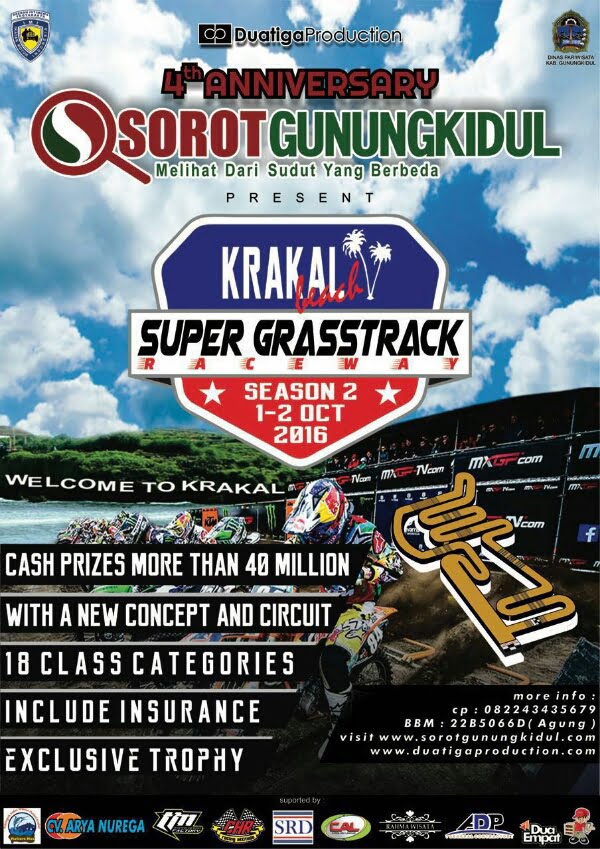 OtomotifZone.com-Gunung Kidul. Agenda akhir pekan ini kembali arena grasstrack di lingkup Daerah Istimewa Yogyakarta tepatnya di Gunung Kidul. Ulang tahun SOROT Gunung Kidul Dua-tiga Production ditunjuk sebagai EO menggelar Krakal Supergrasstrack Season 2 pada tanggal 1-2 Oktober 2016 Sabtu dan Minggu esuk.