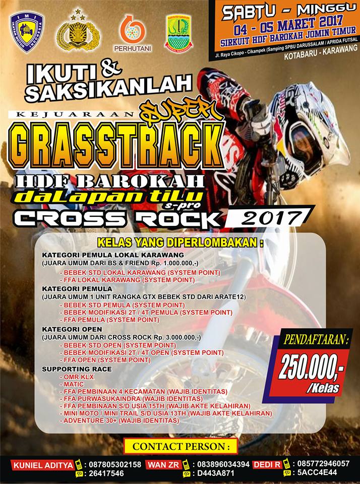 OtomotifZone.com-Karawang. Kompetisi balap motor grastrack kembali hadir di sirkuit HDF BAROKAH Jomin Timur, Kota Baru-Karawang, tanggal 4-5 Maret 2017 dengan nama event “Kejuaraan Super Grasstrack HDF BAROKAH daLapan tiLu s-pro CROSS ROCK 2017”. Kelas yg diperlombakan: