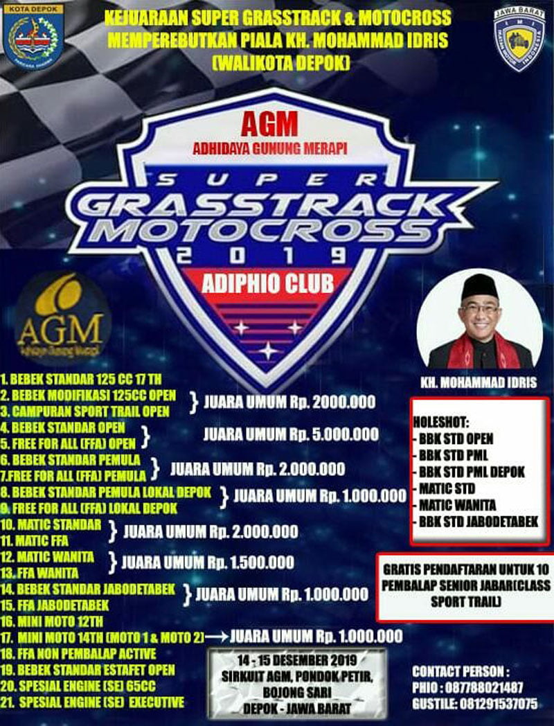 OtomotifZone.com – Depok – Akhir pekan ini tepatnya tanggal 14 dan 15 Desember 2019 bakal ada kejuaraan balap motor di lintasan tanah yang mengusung titel AGM Supergrasstrack Motocross Adiphio Club sekaligus memperebutkan Piala KH. Mohammad Idris selaku Walikota Depok, Jawa Barat di sirkuit AGM, Pondok Petir, Bojongsari, Depok. Dan pastinya ajang kali akan dihadiri banyak peserta yang berasal dari berbagai daerah untuk mengikuti di 21 kelas dilombakan.