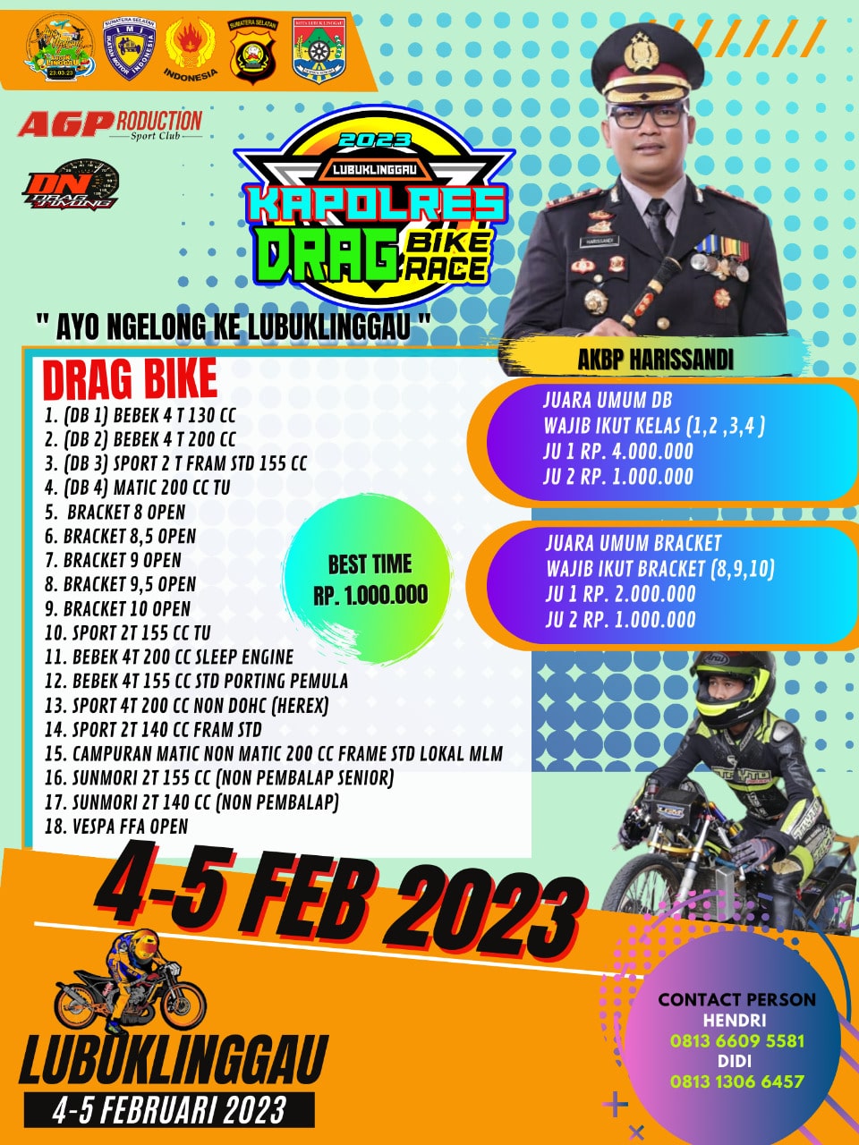 Memang kalau bicara event, AGP tidak pernah tanggung tanggung. Kali ini saja dirinya akan membuka 18 kelas bergengsi pada gelaran Kapolres Drag Bike Lubuklinggau. Panitia akan membuat 2 katagori yang nantinya akan ada katagori Juara Umumnya. Tidak hanya sampai disitu saja, ada juga hadiah best time untuk pebalap tercepat di event tersebut.