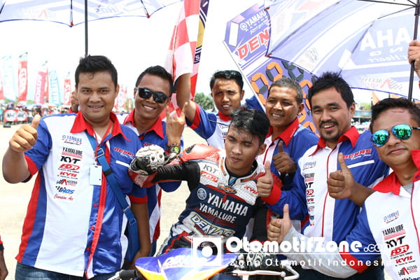 Sontak sorak sorai dan gemuruh bangga serta haru kebanggaan terlihat dari teriakan Defri Nasri sang owner team Denas sambil memeluk erat pembalapnya.