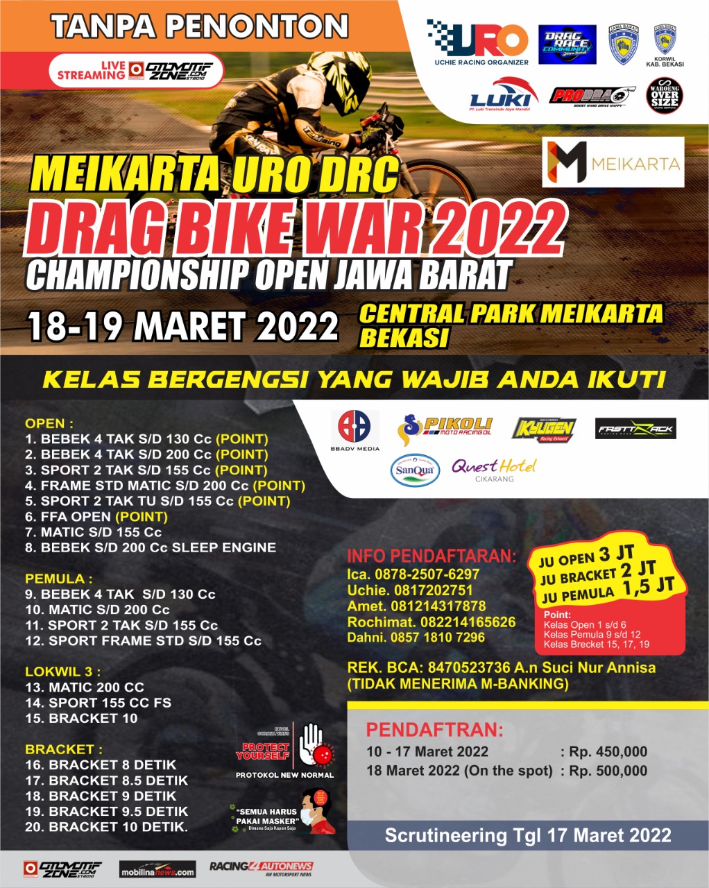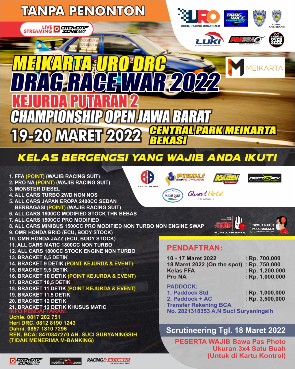 Memang Meikarta URO DRC kerap sekali mengadakan event double. Alias dua event jadi satu. Dan kali ini mereka kembali adakan hal serupa. Jadi nantinya Drag Bike atau Drag motor akan diselenggarakan (18-19/3/22). Sedangkan Drag Race atau Drag Mobil akan diselenggarakan (19-20/3/22). Jadi selama tiga hari gelaran balap ini akan diselenggarakan.