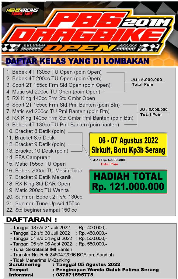 OtomotifZone.com – Serang. Akhir pekan ini gelaran Drag Bike yang dinanti nantikan akan diselenggaran. PBS DRAG BIKE OPEN akan berlangsung (6-7/8/22) di Sirkuit NP Boru KP3B, Serang, Banten. Panitia penyelenggara akan membuka 22 kelas. Yang mana selain itu panitia juga akan membanjiri hadiah pada gelaran ini.