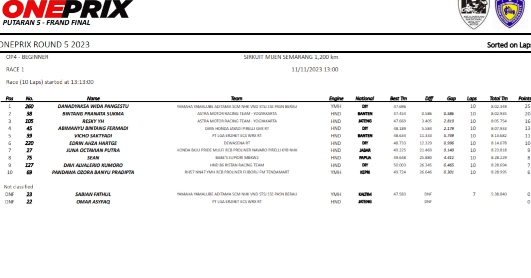 OtomotifZone.com-Semarang. Final Oneprix di sirkuit Mijen, Semarang, 11 November 2023 pada kelas Beginer mengerucut kepada duet Astra Motor Racing Team. Keduanya adalah Rezky YH dan Bintang Pranata Sukma sedang memuncaki posisi klasemen sementara. Rezky membawa poin 154 sedangkan Bintang 135.