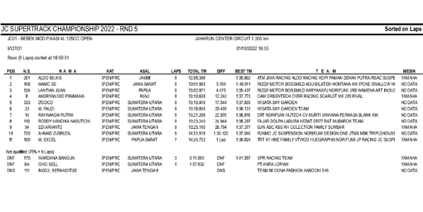 Aldo lenggang kangkung mengemas juara di pertandingan awal. Di susul Mamo lalu Lantian Juan Yang berjuang dari urutan belakang. Berikut hasil race moto 1 Bebek Modif Open Seri 5 JC Supertrack 2022 sirkuit Jaharun Center, Jalan Besar Petumbukan, Galang, Kab.Deli Serdang 1-2 Oktober 2022.