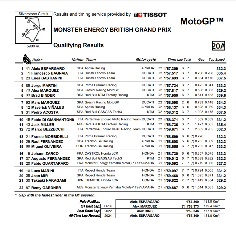 “Saya sangat senang dengan hasil ini. Tim telah bekerja keras sepanjang akhir pekan, dan pole position ini adalah hasil dari kerja keras kami,” ujar Espargaro dalam konferensi pers setelah kualifikasi. “Silverstone adalah sirkuit yang sangat menantang, dan saya berharap bisa memberikan yang terbaik di balapan nanti.”