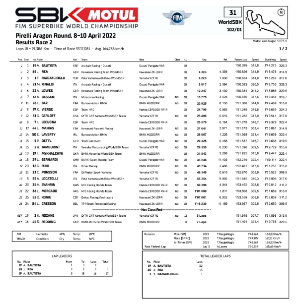 Tak tanggung-tanggung. Elvaro memimpin dari lap 3 sampai 18 atau sampai selesai race. Duel seperti kala Race 1 dan Race Superpole tidak terjadi pada balap penutup tersebut. Enggan bermain-main dan tidak mau terlibat duel. Ketemu set-up menjinakkan Ducati Panigalenya Bautista finish dengan gap 4.393 di depan Jonathan Rea juga Toprak Razgatliouglu. Berikut hasil racenya.