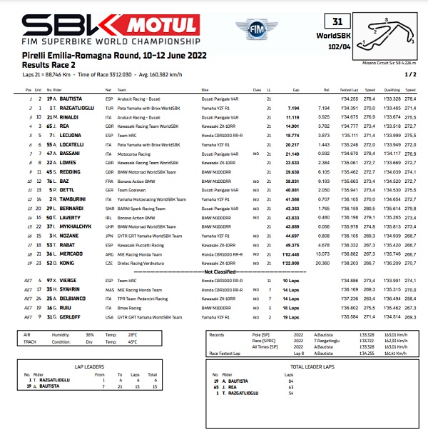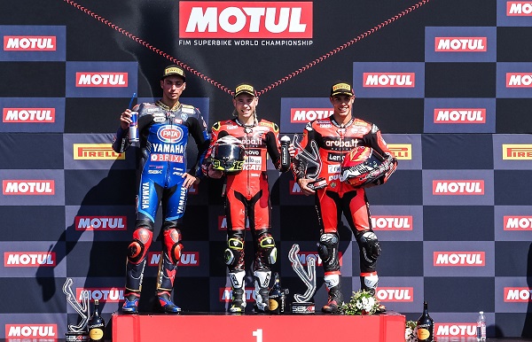 Nyata sekali bahwa Panigale Aruba.it makin berotot. Michael Ruben Rinaldy juga ikuti hoki naik podium dua kali berturut meski start dari urutan kesepuluh. Sementara Jonathan Rea harus tersisihkan dari posisi tiga besar. Pembalap Kawasaki ini finish urutan keempat. Kita lihat hasil racenya.