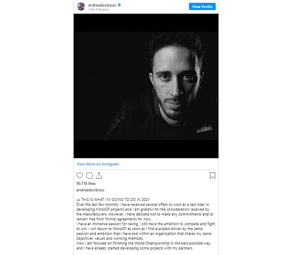 “Inilah yang akan saya lakukan pada 2021. Selama beberapa bulan terakhir, saya telah menerima beberapa tawaran untuk bekerja sebagai pebalap tes dalam mengembangkan proyek MotoGP dan saya berterima kasih atas pertimbangan yang diterima oleh beberapa pabrikan. Namun, saya telah memutuskan untuk tidak membuat komitmen apa pun dan tetap bebas dari formalitas,” kata runner-up MotoGP 2017-2019 ini.