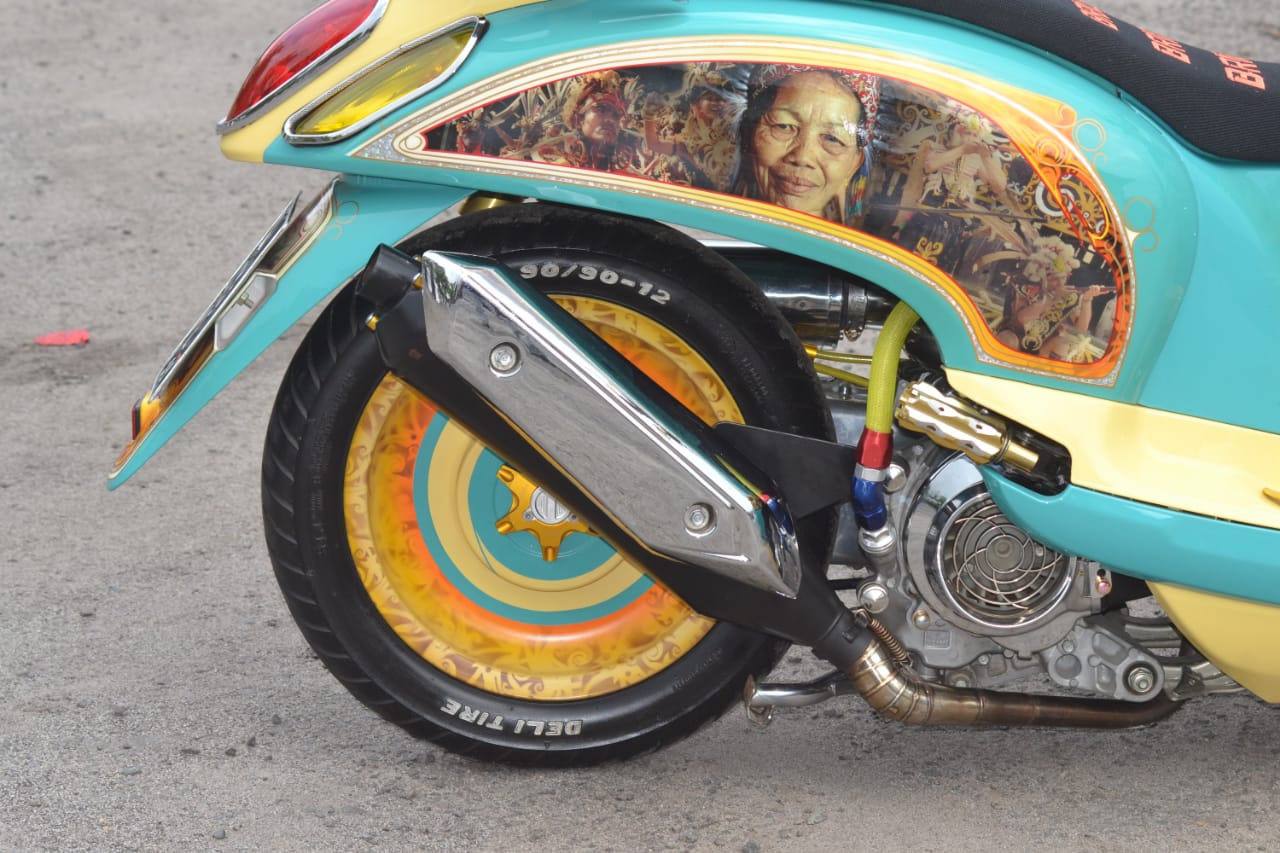 Untuk mewujudkan itu semua, Adit lantas rela order jauh sampai ke pulau Jawa, tepatnya ke bengkel cat Tom’s Paint Airbrush di kawasan kota Sidoarjo, Jawa Timur. Sesuai keinginannya, di bagian sudut detail bodi Scoopy diberikan motif tentang kehidupan suku Dayak seperti adanya sosok wanita tua yang memiliki bagian ujung telinga bawahnya memanjang.