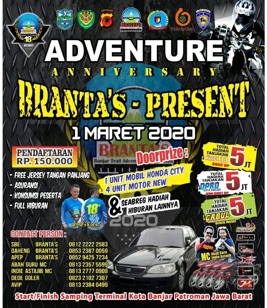 Kegiatan trail adventure kali ini dalam rangka memperingati hari jadi BRANTA’S yang ke 18 tahun ini dipastikan akan semarak dan juga bakal heboh. Karena selain kemasan acara yang ciamik juga dibanjiri banyak hadiah. Dan yang pasti akan menarik bagi para peserta yang tentu tidak hanya berasal dari wilayah Jabar saja, tapi juga dari Jateng yang memang dekat dengan kota Banjar ini.