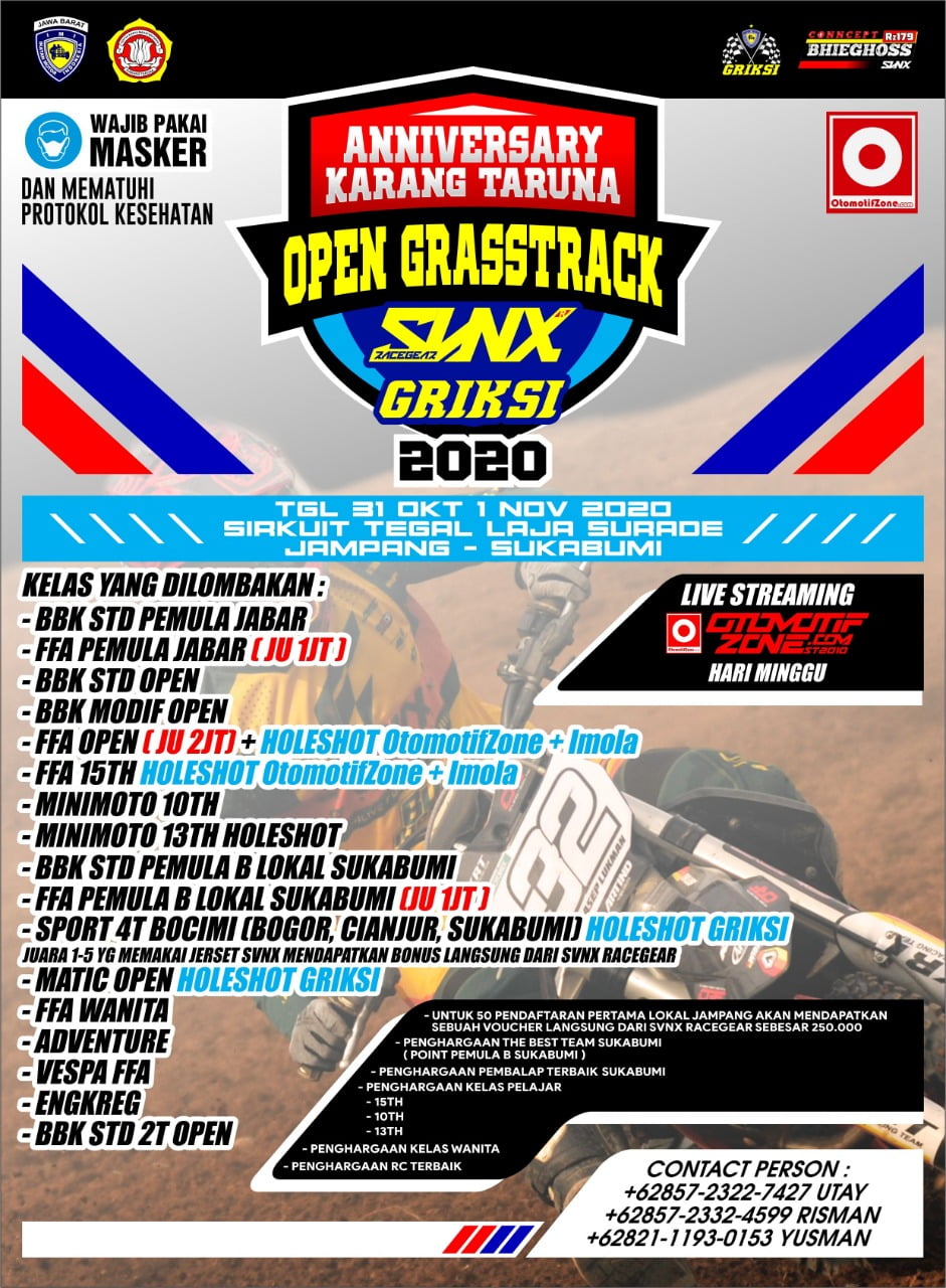 OtomotifZone.com – Sukabumi. Anniversary Karang Taruna Open Grasstrack SVNX Griksi 2020 di gelar di sirkuit Tegal Laja, Surade, Jampang, Sukabumi, Jawa Barat, akhir pekan ini (31/10-1/11). Meskipun ajang ini sebatas kejuaraan club event lokal dalam rangka memperingati Karang Taruna Desa setempat, namun bakal manjakan pembalap dan di kemas apik yang jadi ciri Bhieghoss Concept selaku konseptor balap grasstrack Jabar.