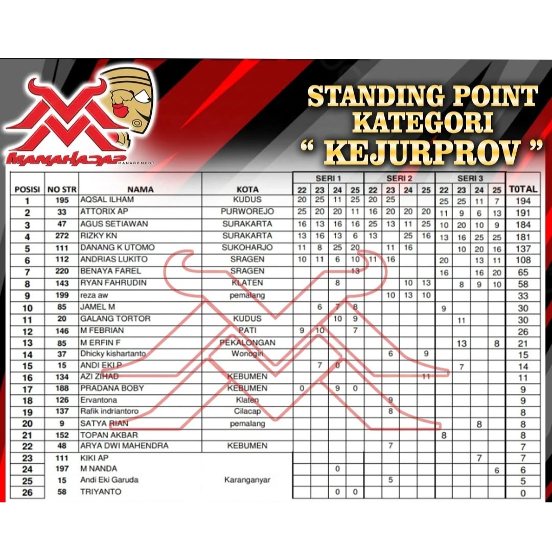 Aqsal ada di posisi teratas standing point kategori Kejurprov. Pembalap asal Kudus ini koleksi 194 point. Dan belum begitu aman karena Atorix AP tepat di bawahnya dengan 191 point. Belum lagi Agus Kempul Setyawan siap mengacaukan persaingan juga. Dia membawa point 184 angka. Di belakangnya masih ada Rizky KN dengan 182 point. Makin panas perjalanan point Kejurprov Jateng pekan ini.