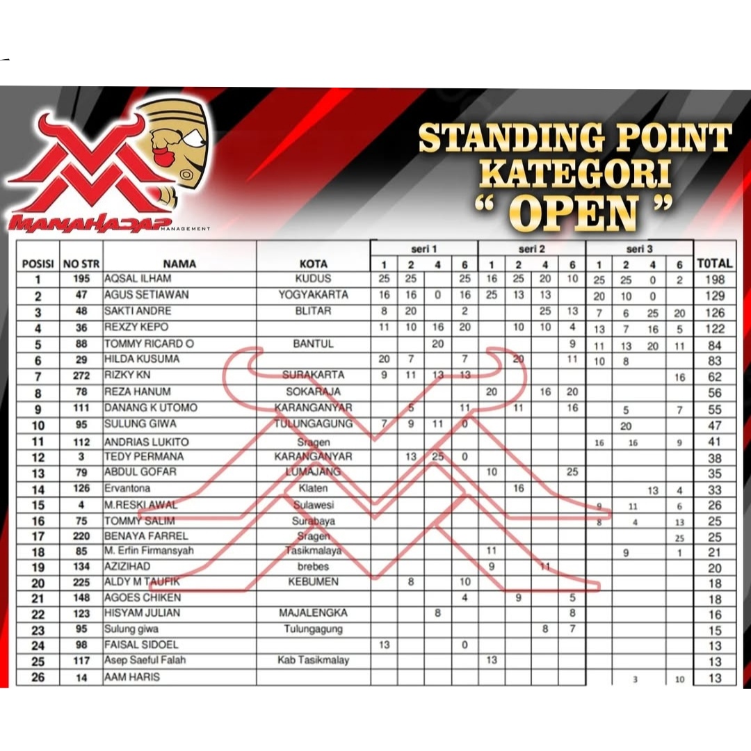 Di point kategori Open mungkin sedikit berbeda. Aqsal mempunyai gap agak jauh. Dia 198 dan Agus Kempul Setyawan 129. Usahanya tetap stay di klasemen teratas masih bisa dengan nafas aman. Apakah kedua klasemen akan di akhiri dengan JU semua?