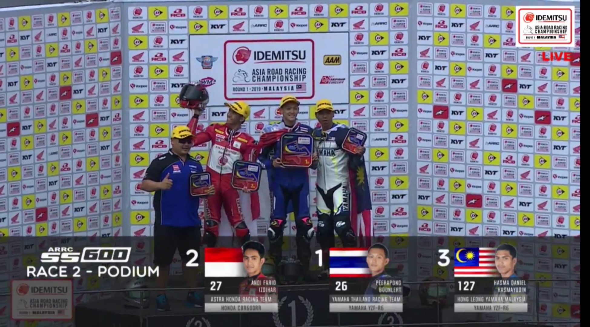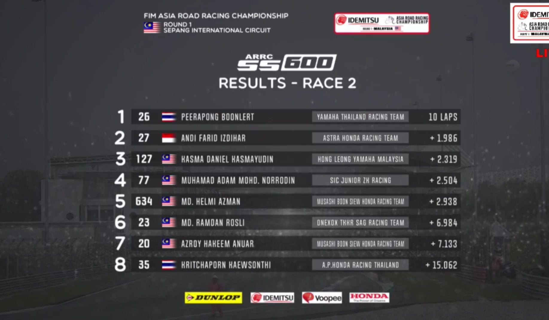 Kesalahan yang dilakukan oleh Kasma, tidak di sia siakan oleh Andi Farid Izdihar, pembalap yang menunggangi CBR600RR ini terlihat cukup impresif namun sayang Peerapong Boonlert berhasil meninggalkan para pesaingnya di rombongan kedua yang terlibat persaingan sengit memperebutkan podium 2.