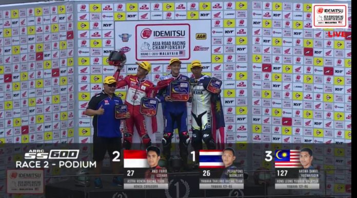 OtomotifZone.com – Jakarta. Pembalap tim Astra Honda Racing Team, Andi Farid Izdihar atau biasa di kenal dengan nama panggilan Andi Gilang sukses menempatkan dirinya berdiri di podium kedua di Kelas Supersport 600 race 2 gelaran Asian Road Race Championship (ARRC) Seri 1 Sepang 2019 yang berlangsung di sirkuit Internasional Sepang, Malaysia, Minggu (10/3). Pada race sebelumnya Andi Gilang harus puas menempati posisi kelima.