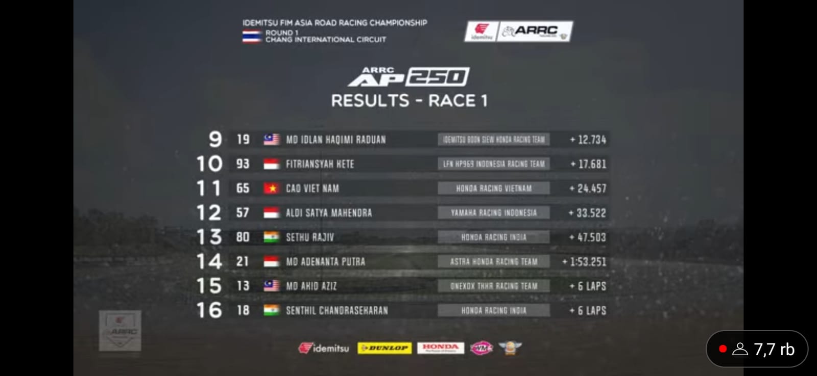 Pertarungan sengit sudah terjadi dari awal Lap. Dan hal yang paling menegangkan ketika lap lap akhir. Semua pebalap berlomba untuk menyentuh garis finish terlebih dahulu. Harus ada drama di tikungan terakhir yang membuat dua pebalap Indonesia terjatuh. Namun demikian, Indonesia tetap mewakilkan dua pebalapnya.