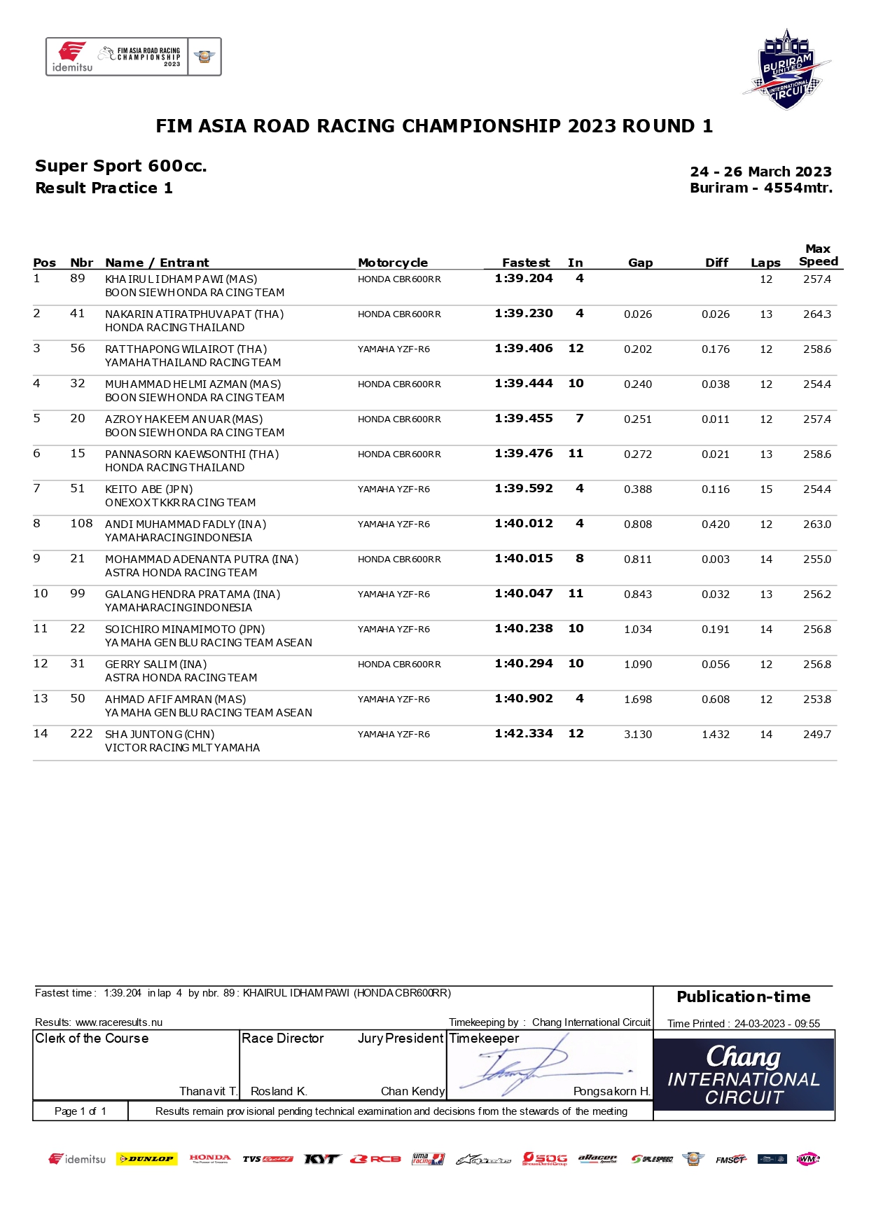 Lalu siapa pebalap tercepat di FP1? Ya dia adalah Khairul Idham Pawi pebalap BOON SIEW Honda Racing Team. Pebalap asal Malaysia ini mampu tampil apik. Dirinya mampu menjadi yang tercepat meski jaraknya dengan pebalap tuan rumah sangat tipis. Lalu posisi berapa pebalap Indonesia? Karena pada kelas SS600 ada empat pebalap Indoensia. Berikut hasilnya:Â