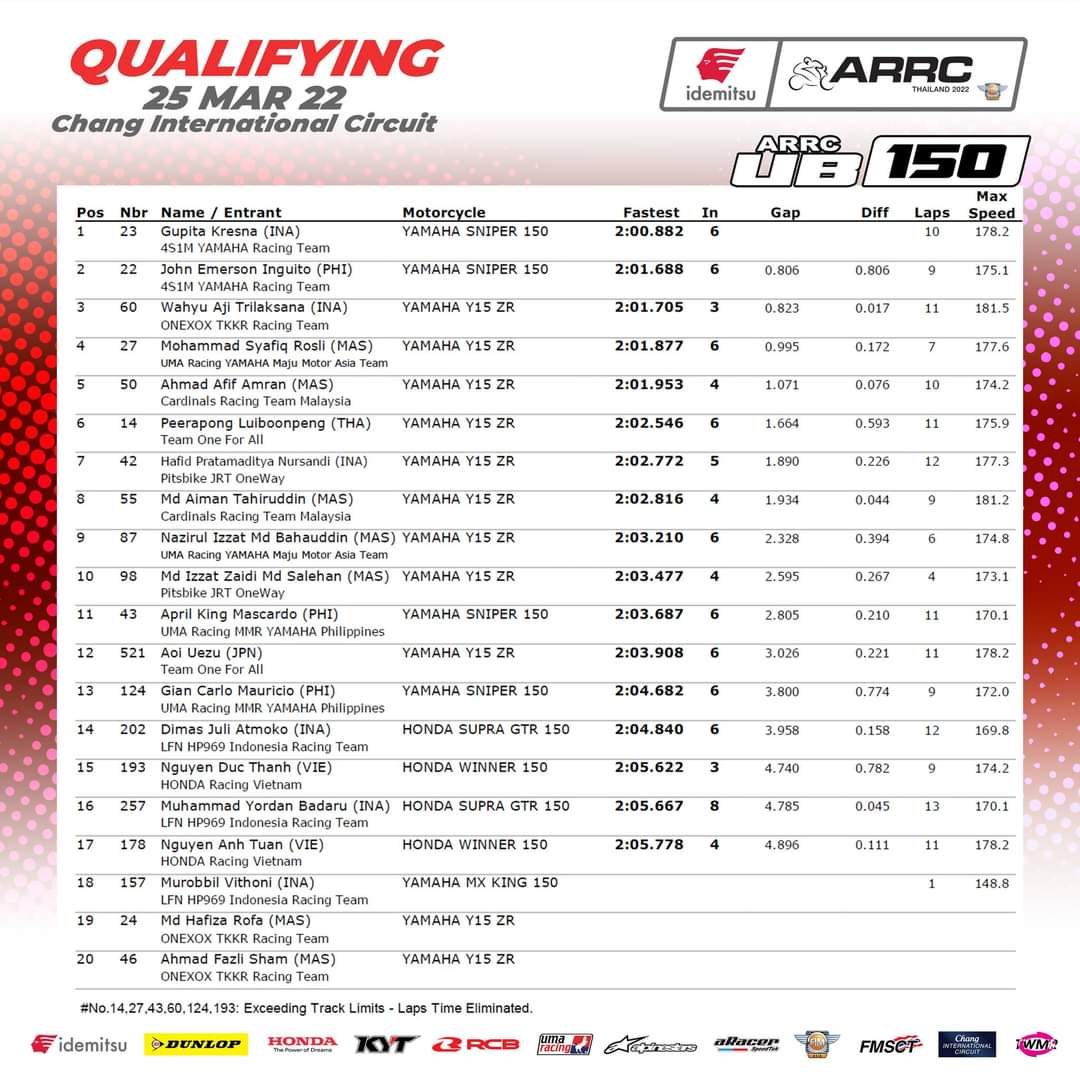 OtomotifZone.com – Thailand. Bikin geger babak kualifikasi UB150. Pebalap Indonesia mendominasi sejak latihan bebas. Tapi siapa sangka, pebalap Yogyakarta akan menjadi yang tercepat di babak kualifikasi. Raihan waktu yang dicapai juga sangat luar biasa. Ini terlihat dari hasil time lawan lawannya di UB150.