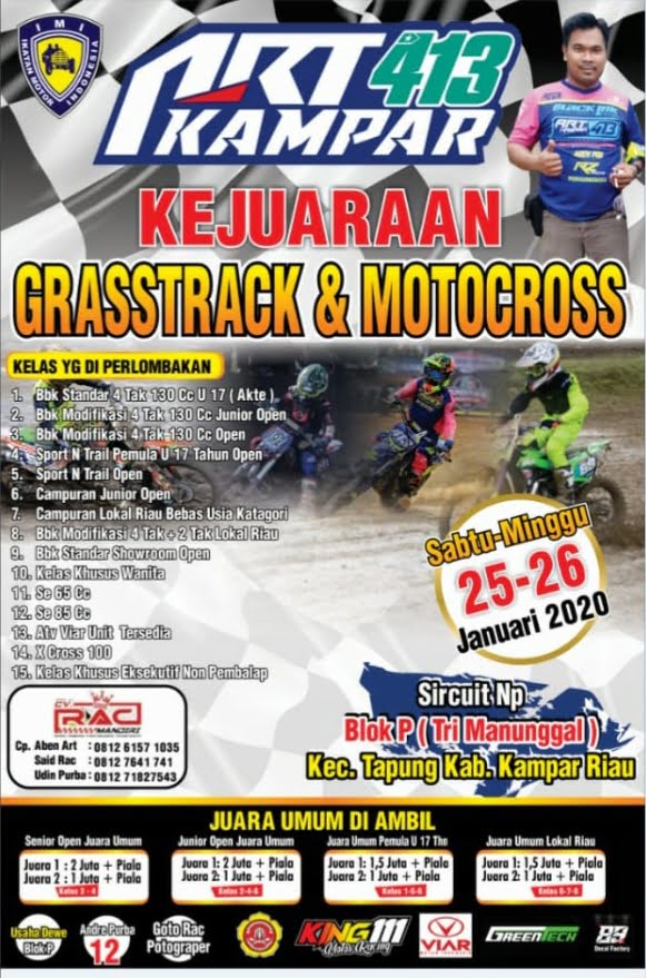 OtomotifZone.com – Riau. Setelah rehat liburan tahun baru akhirnya kini kembali bergulir gelaran cukup spektakuler diawal tahun 2020 ART Kampar 413 Cup Grasstrack dan Motocross 2020 bakal berlagsung di Sirkuit Np Blok P ( Tri Manunggal ) Kecamatan Tapung, Kabupaten Kampar, Riau, Sabtu Minggu (25-26/1).