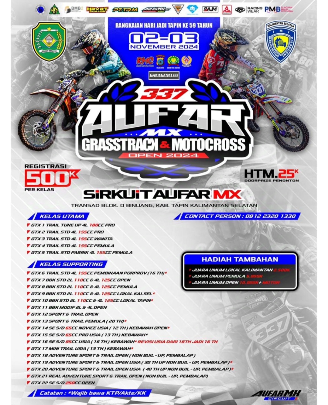 OtomotifZone.com – Tapin. Bersamaan dengan hari jadi Tapin ke 59 tahun event akbar Aufar MX Grasstrack Motocross Open sirkuit Aufar MX, Transad Blok O Binuang, Tapin, Kalimantan Selatan 02-03 November 2024 pekan ini terpantau bakal di hadiri rider-rider top nasional.