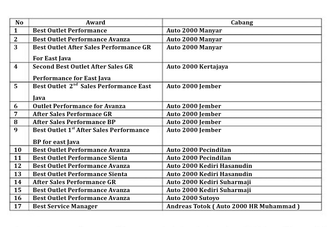 “Penghargaan yang didapatkan oleh team cabang Auto2000 area Jawa Timur di ajang kompetisi The Best Toyota Dealer People Contest 2017 dan acara Toyota Dealer Convention 2018 membuktikan bahwa cabang Auto2000 Jawa Timur memiliki standar kualitas yang tinggi dan sesuai dengan persyaratan ketat yang ditetapkan oleh pihak Toyota Indonesia,” terang Hendra Purnawan, Operation Manager Auto2000 Jawa Timur dalam releasenya.