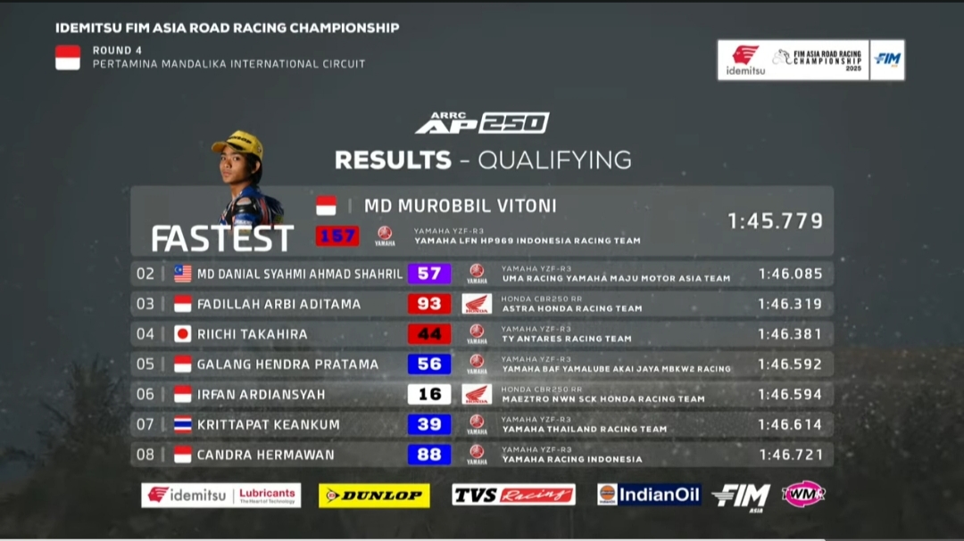 OtomotifZone.com – Lombok. Hasil apik dicetak Murobil Vitoni di Seri 4 Asia Road Racing Championship sirkuit Mandalika, Lombok, Nusa Tenggara Barat 29-31 Agustus 2025. Pembalap yang bernaung bersama team Yamaha LFN HP969 Indonesia ini akhirnya bisa memulai start dari baris terdepan.