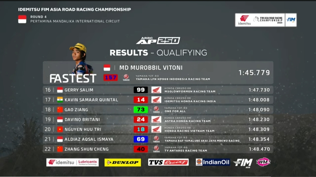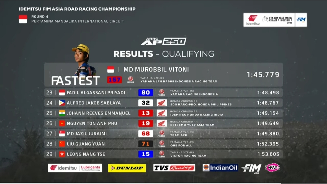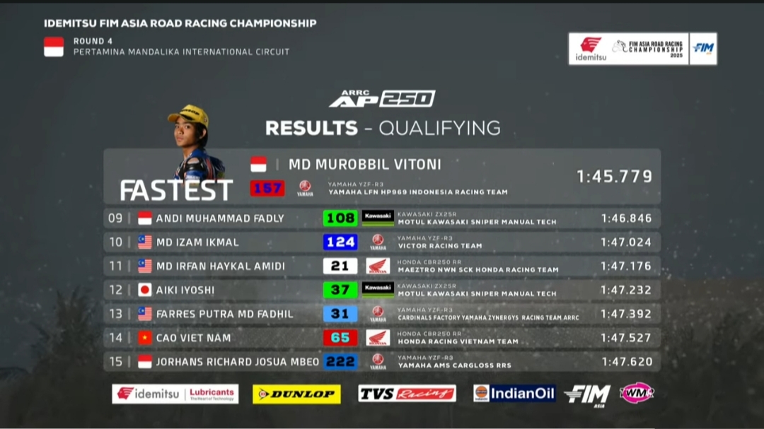 Roby catatkan waktu 1.45.779. Unggul sepersekian detik dari M. Danial Syahmi yang catatkan waktu 1.46.085. Tujuh rider terdepan hanya terpaut jarak tipis nol sekian detik. “Alhamdulillah, kualifikasi sudah dapat hasil baik. Dan semoga race 1 nanti juga kembali ada hasil baik,” ucap Roby.