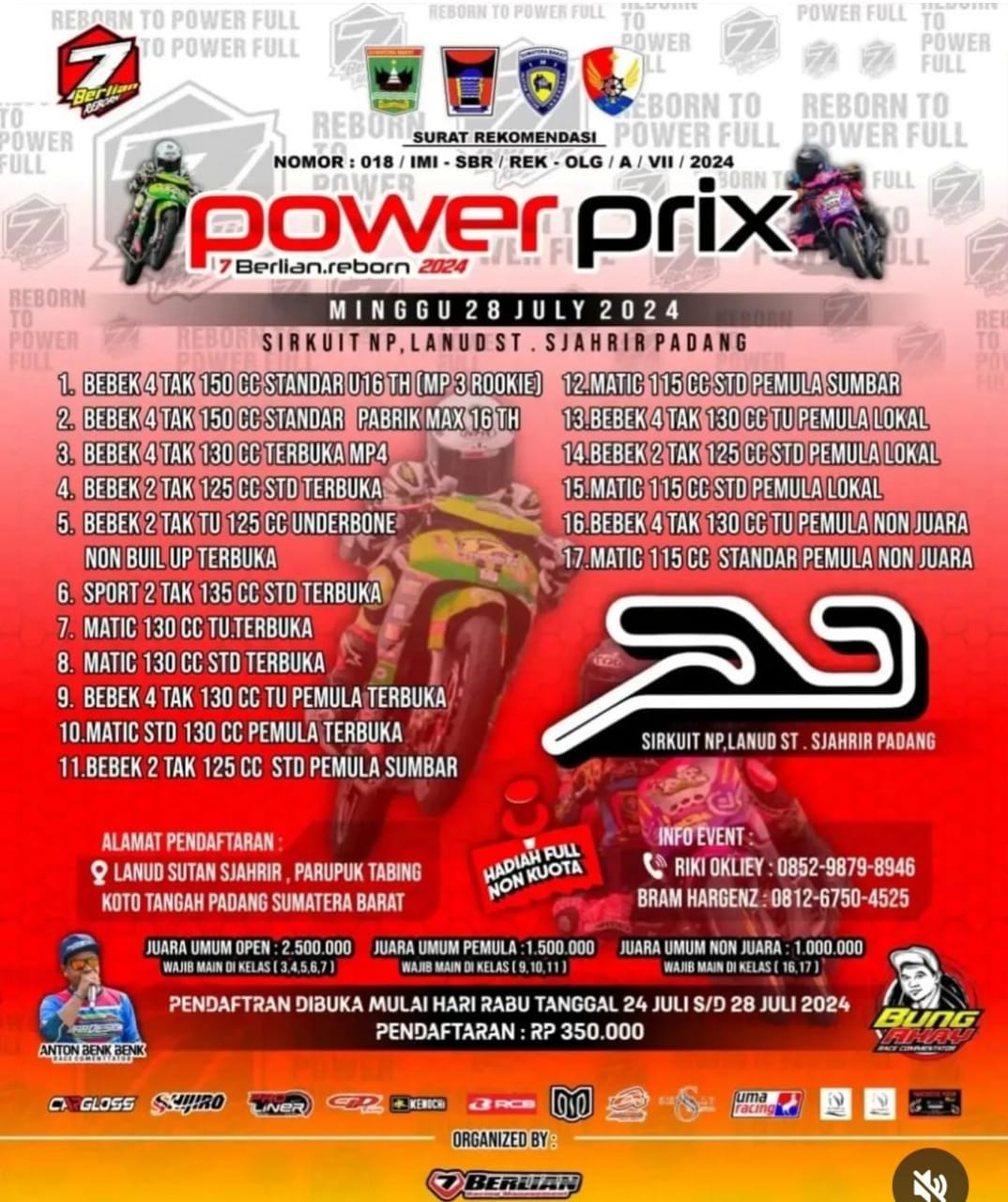 OtomotifZone.com – Padang. Menarik dan menguntungkan kalau kamu ikut turun pada gelaran PowerPrix akhir pekan ini (28/7/24) di Sirkuit Lanud ST Sjahrir Padang, Sumatera Barat. Karena panitia melakukan system hadiah non kuota. Gile bener!!!. Jadi berapapun jumlah peserta maka hadiah akan keluar seperti biasa!!!