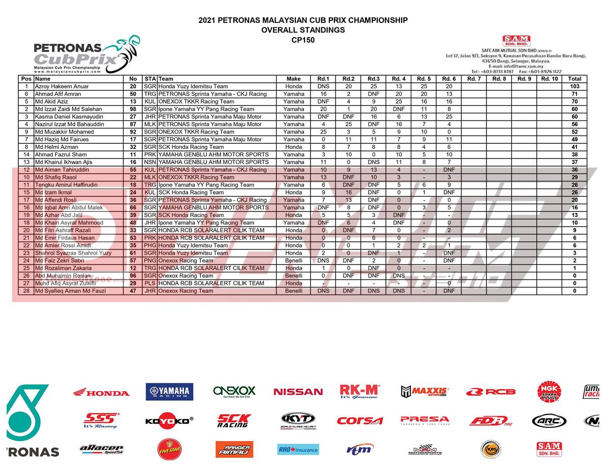 Memang gelaran Malaysian Cub Prix 2021 sedikit terganggu akan pandemi yang menerpa Malaysia. Namun tinggal menghitung bulan saja gelaran ini diprediksi akan selesai pada tahun 2021. Persaingan di kelas CP 150 makin memanas memasuki putaran ke tujuh. Azroy saat ini masih pegang tahta puncak klasemen. Pebalap yang menggunakan Honda Supra GTR 150 untuk tarung diajang MCP ini mengumpulkan 103 point sampai putaran ke enam ini.