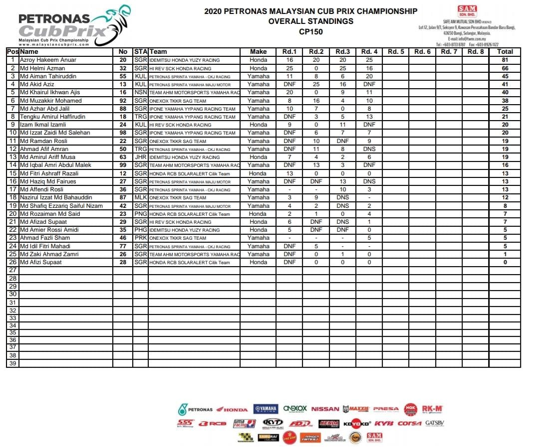 Berikut adalah klasemen sementara di kelas CP150 MCP 2020 selengkapnya :