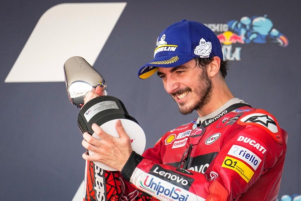 Usai memenangkan kejuaraan Bagnaia merasa tak percaya. “Saya terharu. Kemenangan pertama tahun lalu di Aragon tentu sangat penting, tapi hari ini lebih indah dan jauh lebih sulit. Kami datang dari periode sulit karena berbagai alasan, kami tidak pernah bisa menunjukkan potensi kami yang sebenarnya. Saya tahu bahwa kami berada dalam kondisi yang tepat untuk melakukannya dengan baik. Kami telah bekerja keras sejak Qatar, dan akhirnya hari ini kami tiba siap untuk balapan. Saya mendorong sangat keras dan mencatatkan putaran secara konsisten sepanjang 25 lap. Saya bangga dengan pekerjaan yang telah dilakukan, tidak hanya dengan tim saya berterima kasih, tetapi juga di Akademi dan keluarga saya!” kata Pecco mengutip di halaman Ducati.