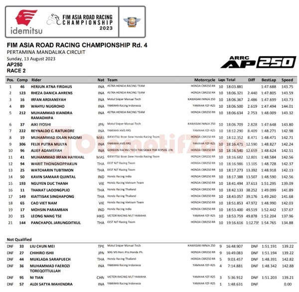 OtomotifZone.com-NTB. Kelas kedua yang tak kalah ketat di antara kelas di Asia Road Racing Championship 2023 sirkuit Mandalika Nusa Tenggara Barat 13 Agustus 2023. AP250 bagaikan perang dengan negara sendiri dan herjun Firdaus berhasil mengamankan juara kembali seperti race pertama dengan gaya balap yang biasa namun dengan hasil yang maksimal.