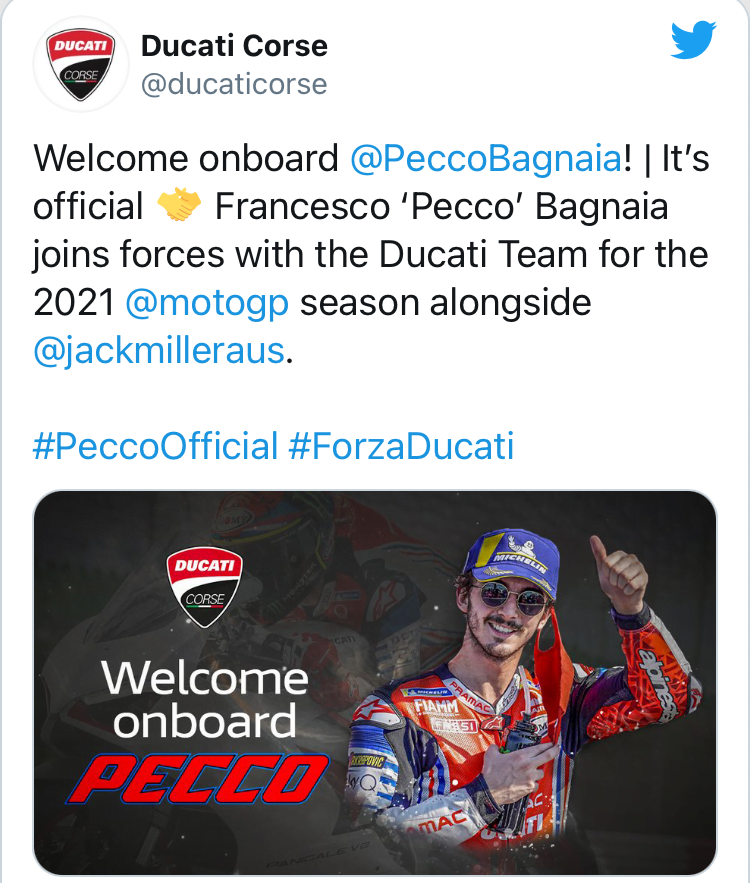 Hasil yang sangat positif di tahun 2020, membuat pembalap berusia 23 tahun itu mendapat penghargaan dengan naik ke tim pabrikan Ducati untuk musim depan. Baik dia dan Miller akan menggeber GP21 pada tahun 2021 dalam barisan Ducati Team.