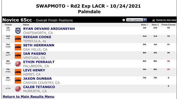 Sedangkan Ryan Ardiansyah juga ikut dua kelas. Yang pertama kelas 65cc Novice, dua kali moto Ryan di posisi empat. Overall hasil point juga di posisi yang sama. Sedangkan kelas 65cc Novice pada moto1 keluar sebagai juara, tapi di moto2 harus turun posisi ke nomer 2. Namun perolehan point tetap paling atas pengumpulannya alias juara 1.