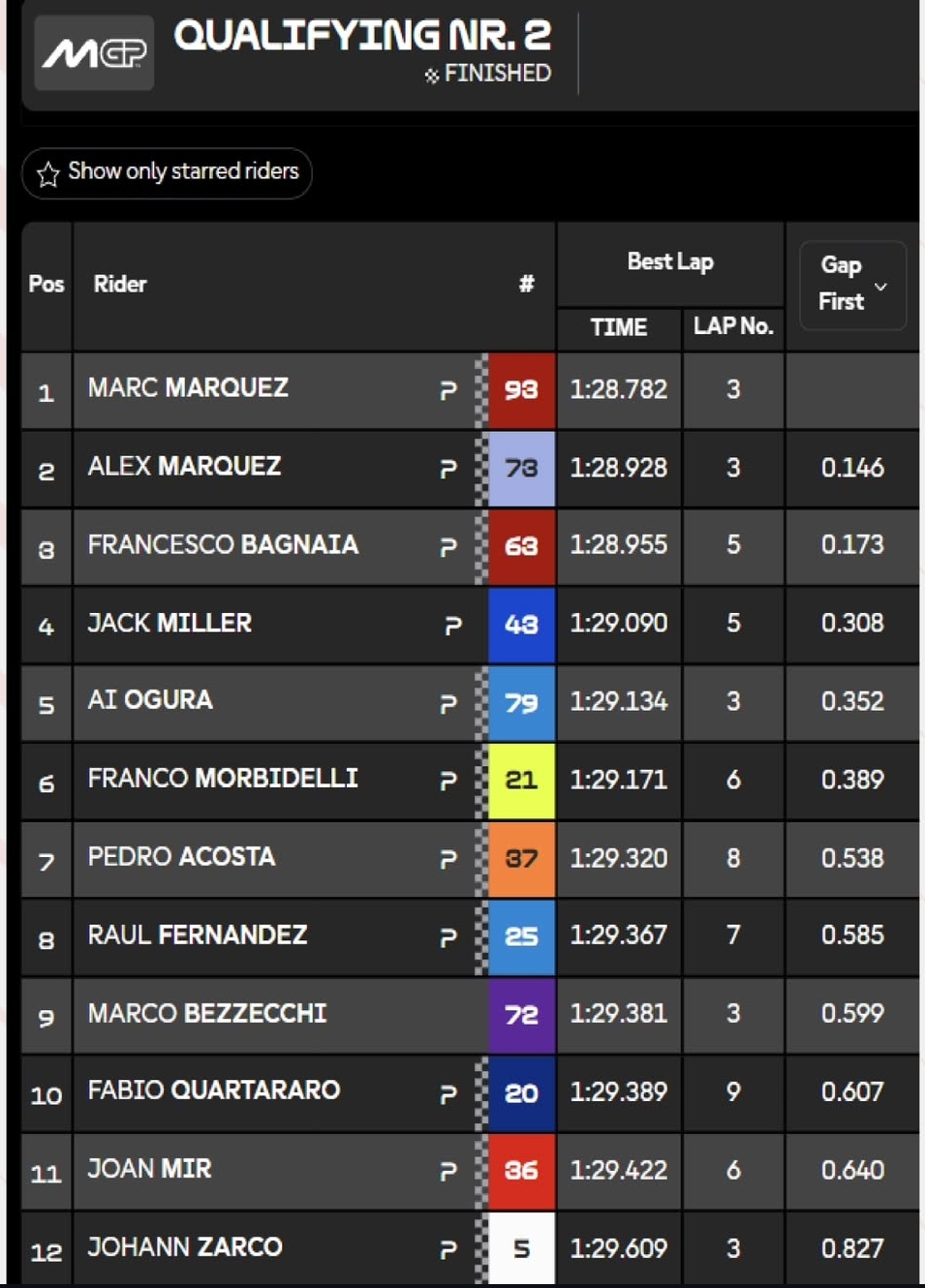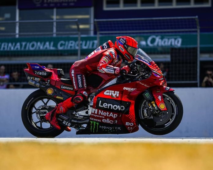 OtomotifZone.com – Bhuriram. Marc Marquez berhasil menjadi yang tercepat pada sesi kualifikasi MotoGP Bhuriram dengan mencatatkan waktu 1.28.782, unggul 0.146 detik dan 0.173 detik dari sang adik Alex Marquez diposisi kedua, dan Bagnaia di posisi ketiga.